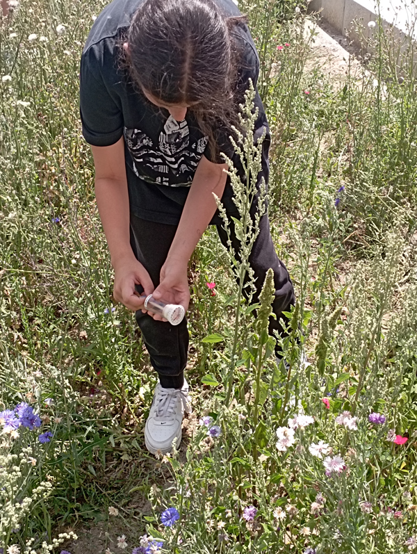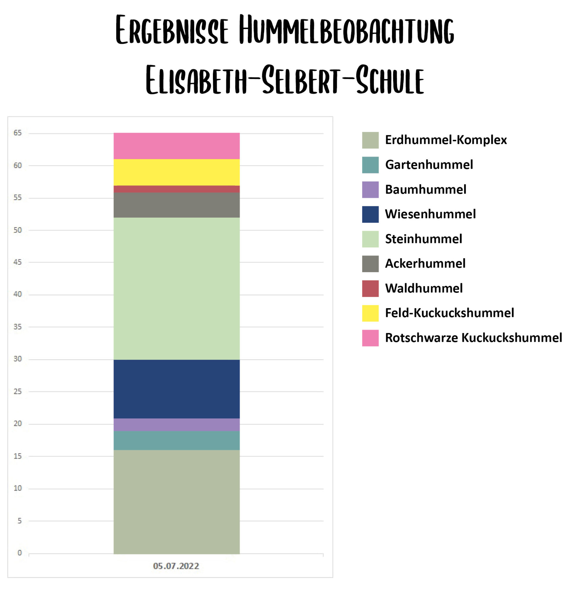 Die Elisabeth-Selbert-Schule wird als neues Gymnasium im Wiesbadener Stadtteil Dotzheim noch erbaut. Obwohl die Bauarbeiten auf Hochtouren laufen, das Schulgebäude noch nicht fertiggestellt ist und die Schülerinnen und Schüler noch in einer Containersiedlung untergebracht sind, starteten 2022 gleich drei fünfte Klassen mit dem Hummelprojekt. Das Gymnasium mit dem Schwerpunkt „Digitalisierung und Nachhaltigkeit“ hat eine wildbienenfreundliche Gestaltung des noch provisorischen Schulhofs umgesetzt, einen Schulgarten etabliert und in sämtlichen Grünstreifen am Schulgebäude wildbienenfreundliche Pflanzen ausgesät. Die drei Monitoringtermine im Juni 2022 belohnten die Forscherinnen und Forscher prompt mit einer erstaunlichen Vielfalt an Hummelarten.