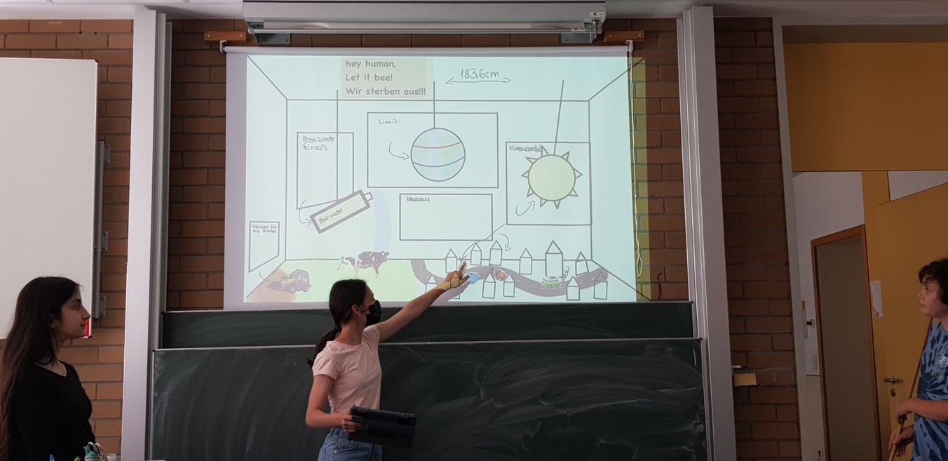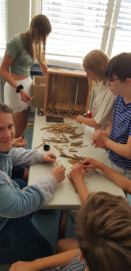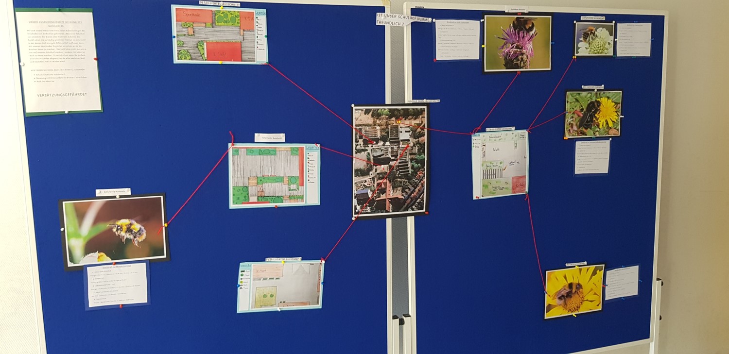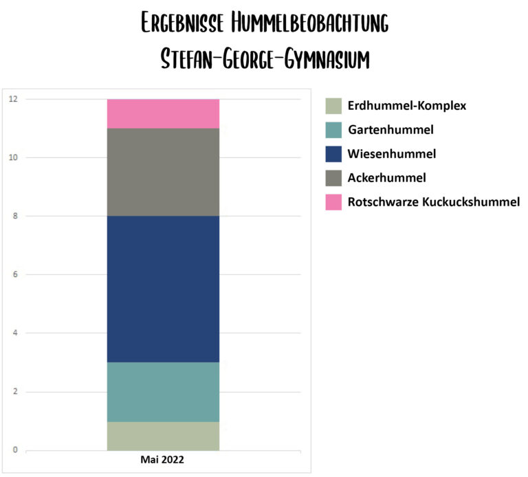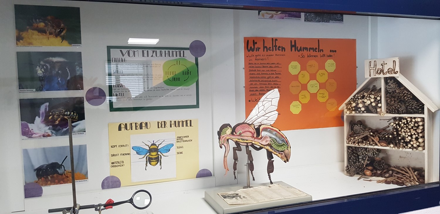 Das Stefan-George-Gymnasium beteiligte sich mit ihrer Klasse 7c am Hummelprojekt. 26 Schülerinnen und Schüler starteten mit großem Engagement in die praktische Schulhofumgestaltung. So entstand neben einem Hochbeet auch eine Blumenwiese direkt vor den Biologie Lehrräumen und bereits bestehende Nisthilfen wurden umgebaut oder aufgewertet. Auch in der Öffentlichkeitsarbeit wurde die engagierte Klasse aktiv und gestaltete in Eigenregie eine Ausstellungswand zum Wildbienenmonitoring sowie zwei Ausstellungsvitrinen zum Thema Wildbienensterben und -schutz. Fazit: Die Verknüpfung von Theorie und Praxis war sehr motivierend! Die Zeitinvestition lohnt sich – für SchülerInnen und Wildbienen gleichermaßen!